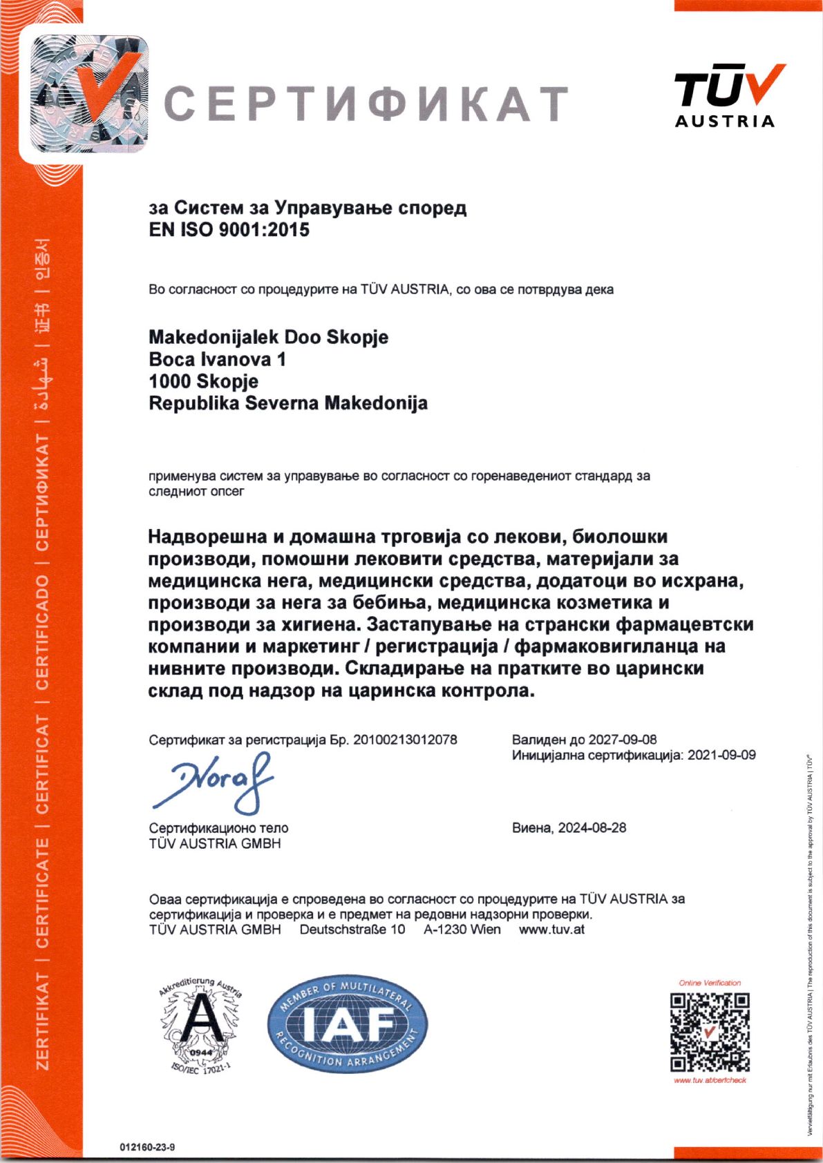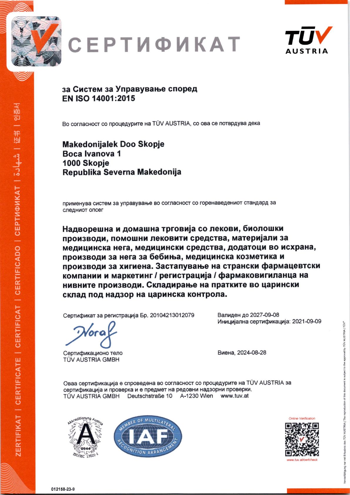 „Македонијалек“ применува систем за управување во согласност со долунаведените стандарди за следниот опсег: